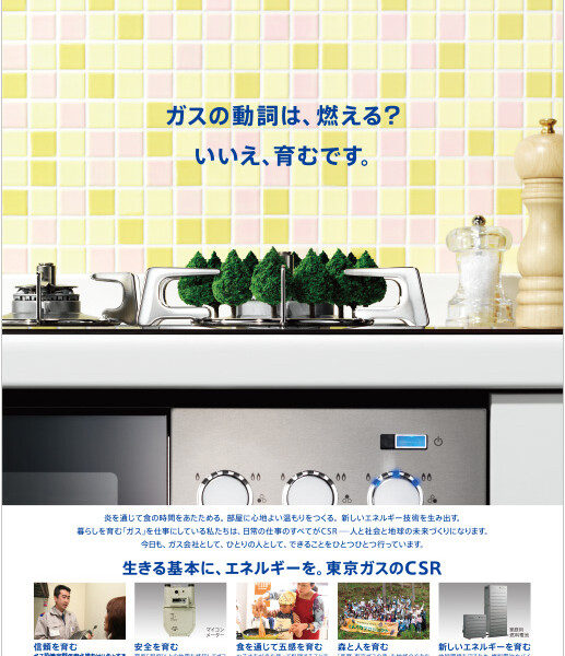 TOKYO GASの雑誌広告シリーズ。食育から環境、CSR。そして、床暖房やM isty、ピピッとコンロなどの商品紹介まで、幅広い様々なテーマを表現しています。